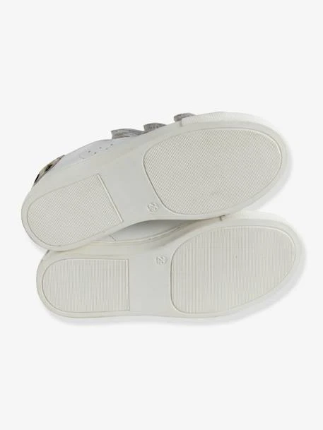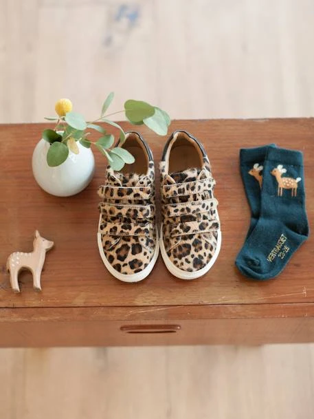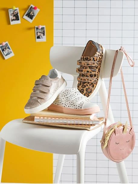 - Dessus : croûte de cuir poilu (coloris effet léopard) ; autres coloris : croûte de cuir (marine) ou cuir (blanc) avec pattes auto-agrippantes métallisées multicolores