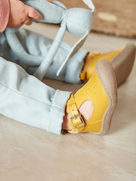 Extrême souplesse, coloris ensoleillé, forme salomé : ces sandales en cuir vont faire le bonheur des bébés qui bougent ! Une création exclusive pour le confort et le bien-être des petits pieds ! Elles offrent une grande liberté de mouvement et permettent d’accompagner l’évolution du pied de bébé vers la marche en assurant un bon développement durant ses moments de jeu et de déplacements.